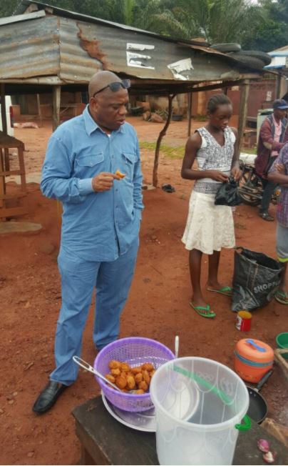 Former governor of Abia state and billionaire businessman, Dr. Orji Kalu was spotted early morning today buying and eating bean cakes popularly known as ‘Akara’ on the roadside with friends and colleagues in Abia state.